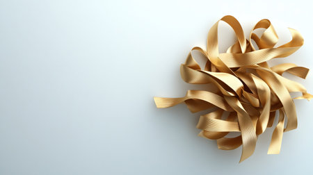 A close-up shot of a golden ribbon bow on a white background, perfect for gift wrapping or decorative purposes.