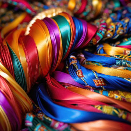 Close-up of various gift ribbons with a focus on texture and color variations, great for detail-oriented themes,