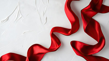 A top view of two beautiful red ribbons draped across a white surface, their sleek, satin texture shining under the light, evoking a celebratory mood.