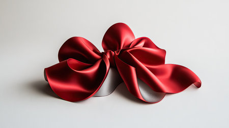 A vibrant red satin ribbon holiday bow with four elegant loops and a soft gray sheen, lying flat on a plain white surface.