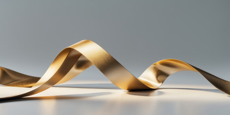 A stunning 3D golden ribbon gently curves against a dark background, radiating a glowing light, perfect for modern design or artistic projects.
