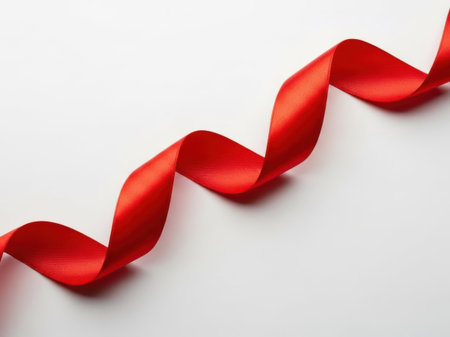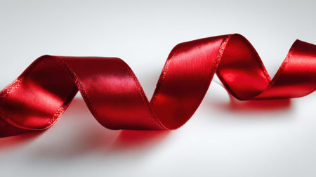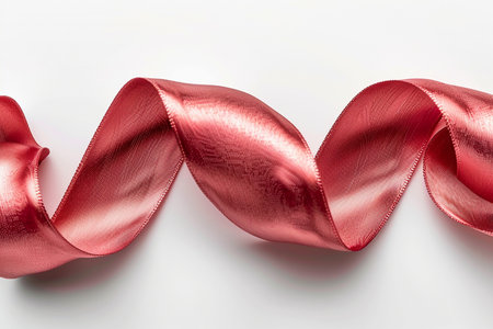 This image features a single, vibrant red ribbon elegantly curled and isolated against a clean, white background. The ribbon is the central focus, creating a striking contrast with the plain white backdrop. The image is ideal for various design and decorative purposes.
