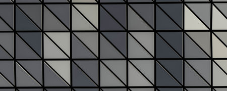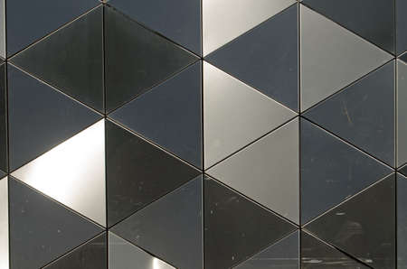 Background with shiny metal triangles at differing angles reflecting the light. Architectural detail.