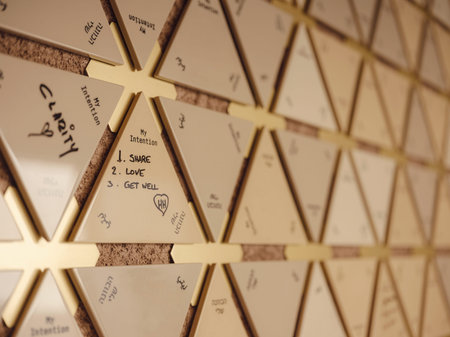 Abu Dhabi, United Arab Emirates - January 13 2024 : people leave wishes on the wall main hall of Abrahamic Family House, inspired by the Document on Human Fraternity.