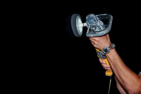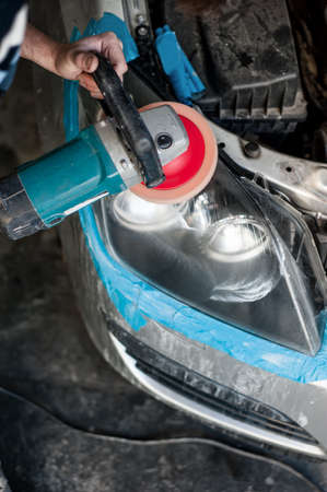 Car headlights cleaning with power buffer machine at car service