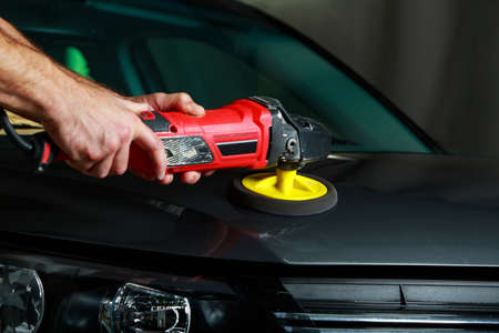 professional mechanic using a power buffer machine for cleaning the body of a car from scratches. Detail of car care concept