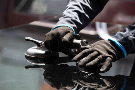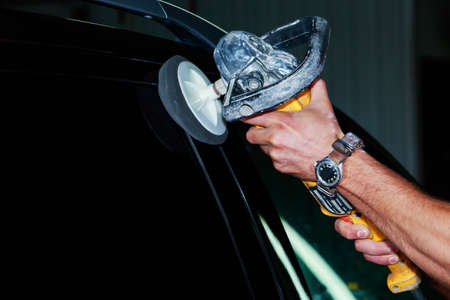 Close-up view on the hands of a man worker who holds a tool polisher for polishing the roof of a car while working in a vehicle detailing workshop. Auto service industry.