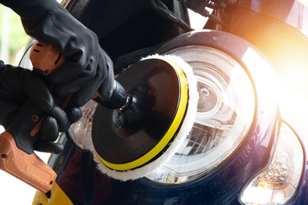 Car headlight cleaning with power buffer machine at service station