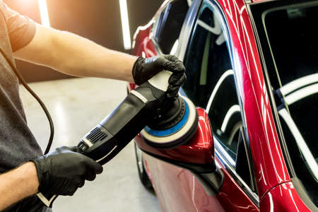 Car detailing - Man with orbital polisher in repair shop polishing car. Selective focus.