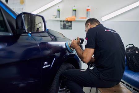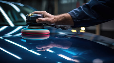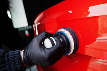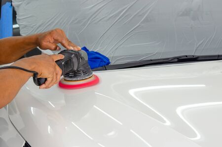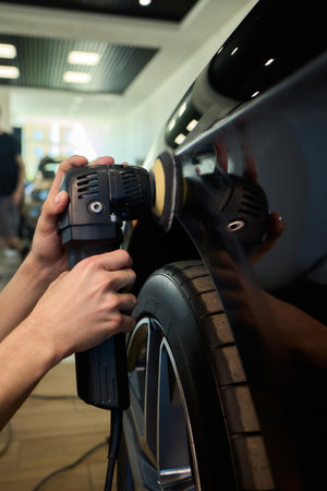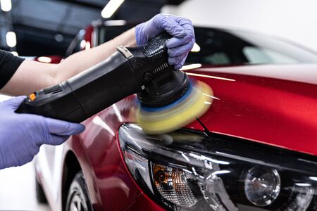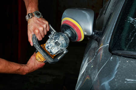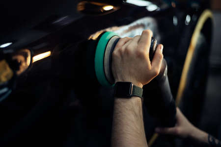 Car detailing - Hands with orbital polisher in auto repair shop,