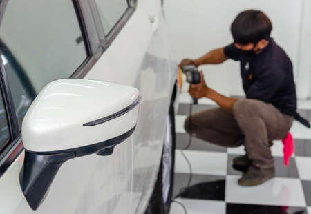 Man worker of car detailing studio polishing and renovating car headlamp.
