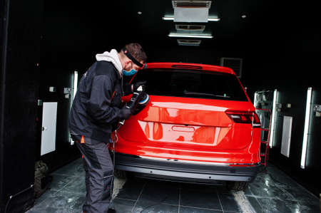 Car detailing concept. Man in face mask with orbital polisher in repair shop polishing orange suv car.