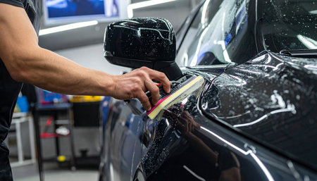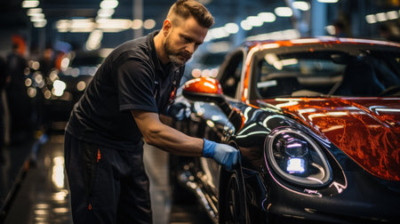 A car detailer skillfully buffs a sleek black vehicle, revealing an impeccable mirror-like shine amidst a bustling workshop atmosphere.