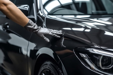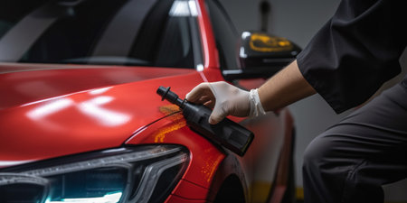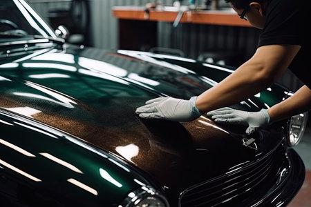 A close-up image of a worker in black gloves polishing the hood of a red car, showcasing the intricate car detailing process in a modern garage.