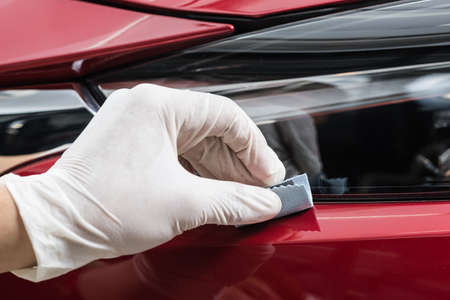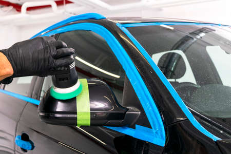 Car polish wax worker hands applying protective tape before polishing. Buffing and polishing car. Car detailing. Man holds a polisher in the hand and polishes the car