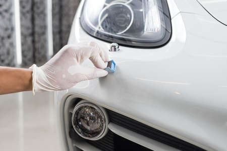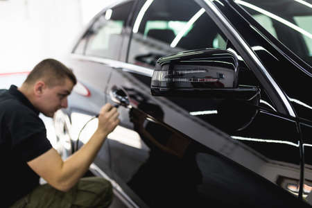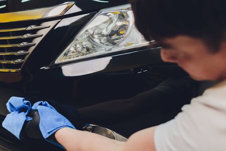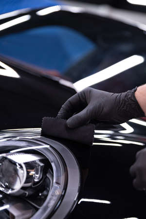 Car detailing - Man applies nano protective coating to the car. Selective focus
