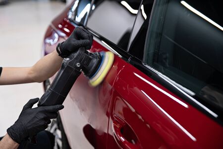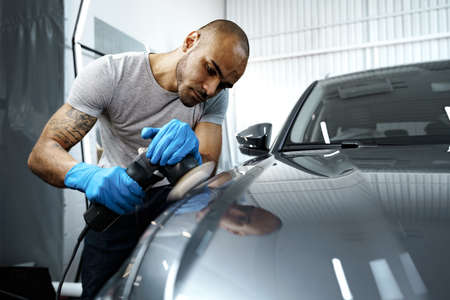 Car detailing studio. Worker polishing scratched car paint with electric polisher.