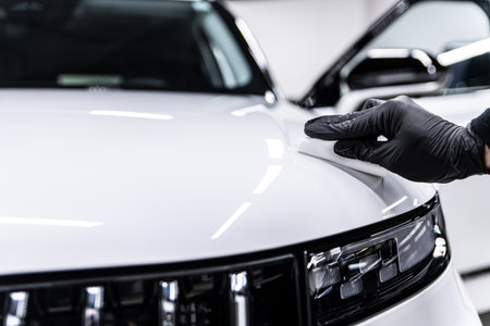 Ceramic coating application on white car hood and front panel during professional car detailing