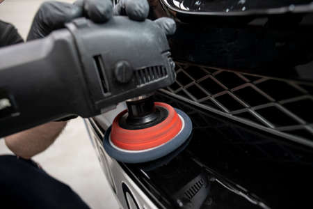 Polished black car polishing machine polished finishing. Car detailing. Selective focus