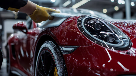 Close-up shot showing a hand in a yellow glove wiping a red sports car with a microfiber cloth. The car is covered in water droplets, emphasizing the cleaning process.