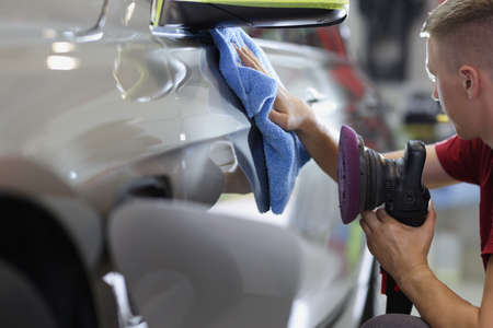Man repairman wiping car with microfiber cloth and holding polishing machine in his hand closeup