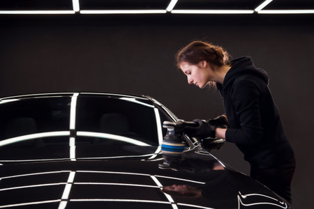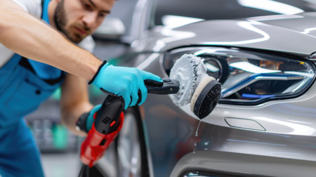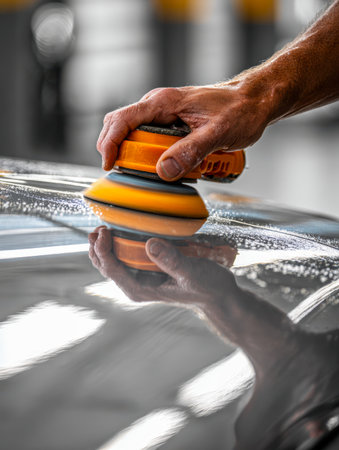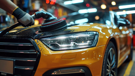 A skilled technician uses a polishing machine to detail a vehicle in a modern automotive workshop, focusing on achieving a flawless surface finish.