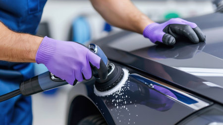 A dedicated worker engages in car detailing, skillfully polishing a modern vehicle