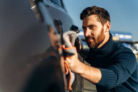 Man wiping his car at the street. Car detailing wash during the sunny day. Handsome bearded man in casual wear washing car doors and hood with microfiber cloth
