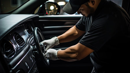 A person meticulously cleans and polishes a vehicle's interior surfaces, ensuring a spotless and shining finish in a professional detailing environment.