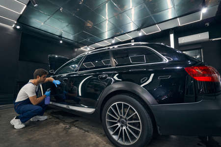 Man worker of car detailing studio applying ceramic coating on car paint with sponge applicator.