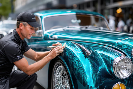 A skilled worker meticulously adds finishing touches to a classic car in a bustling downtown area.