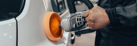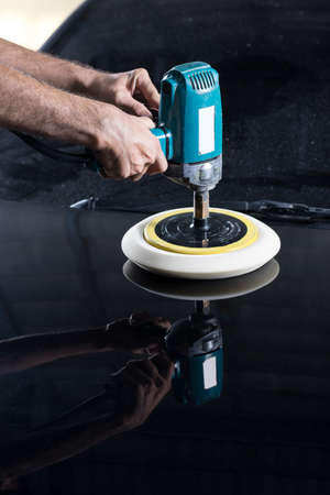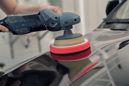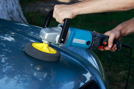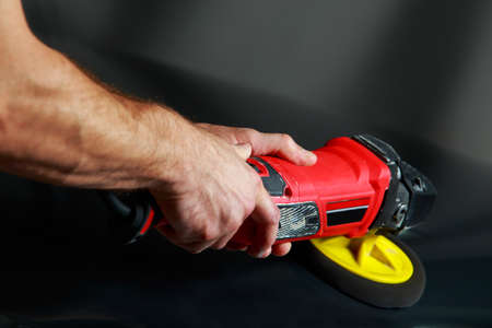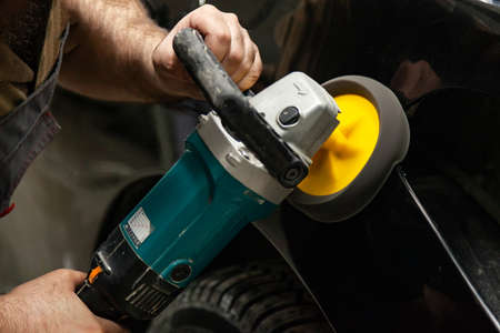 professional mechanic using a power buffer machine for cleaning the body of a car from scratches. Detail of car care concept