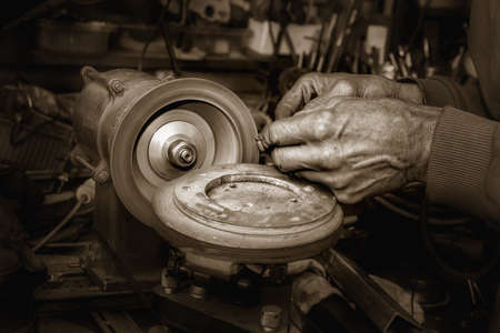Old man's hands with tool and grinding machine with diamond wheel. Close view. Mono color.