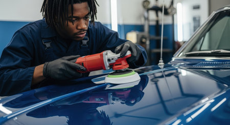 African american man in dark blue overalls and black gloves polishing a blue car hood with an orbital buffer in an auto service garage. focus on professional car detailing, paint correction, and vehicle maintenance.