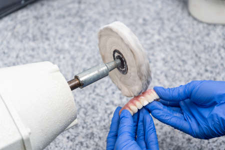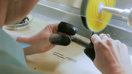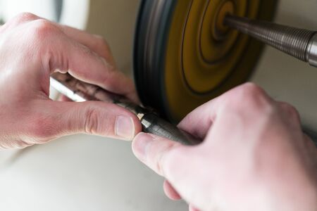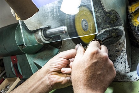 Closeup of jeweler is working at jeweller's workshop. Silver polishing