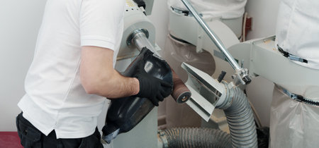 Master in gloves working on prosthetic limb while shaping and forming it on sanding machine