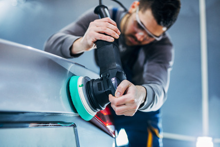 Car detailing - Hands with orbital polisher in auto repair shop. Selective focus.