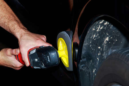 Worker polishing vehicle body with special grinder and wax from scratches at the car service station. Professional car detailing and maintenance concept