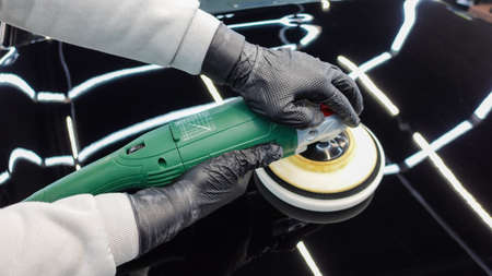 Close-up view on the hands of a man worker who holds a tool polisher for polishing the roof of a car while working in a vehicle detailing workshop. Auto service industry.