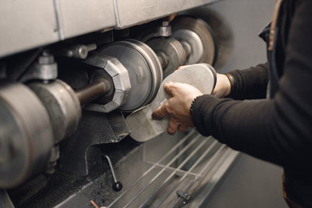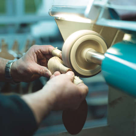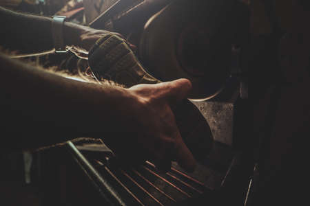 Shoemaker repairs shoes in the studio craft grinder machine.