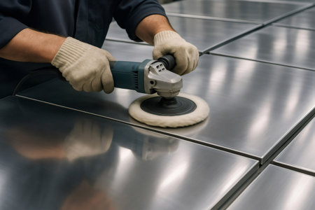 Worker hands using an electric polisher on a brushed stainless steel surface, creating a smooth, polished finish