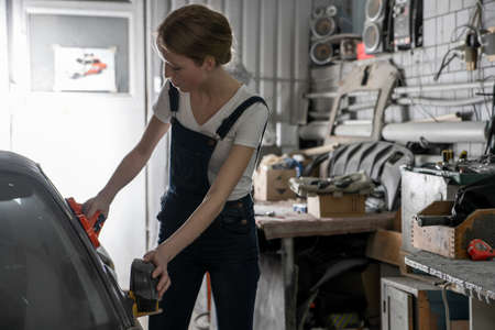 The mechanic works with a grinding machine. Garage painting car service. Repairing car section after the accident.