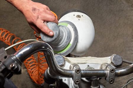Car polish wax worker hands applying protective tape before polishing. Buffing and polishing motorcycle. Car detailing. Man holds a polisher in the hand and polishes the motorcycle.Tool for polishing cars
