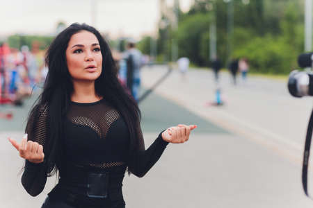 a young beautiful woman is being photographed. photo via phone. the phone is in the hands of a girl. wandering focus.