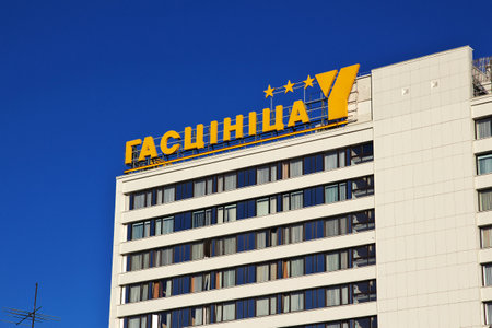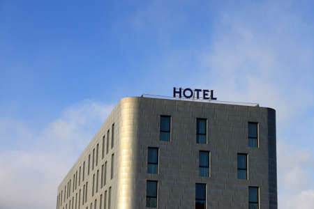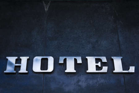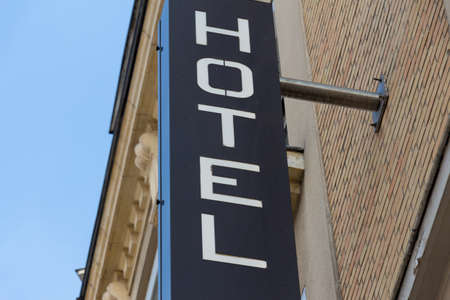 Hotel sign text capital letters attached to facade wall high building entrance with two 2 stars in city center