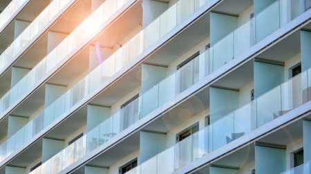 New apartment building with glass balconies. Modern architecture houses by the sea. Large glazing on the facade of the building.