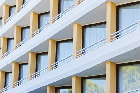 Modern hotel building exterior featuring white walls, teal windows, and balconies against a clear blue sky