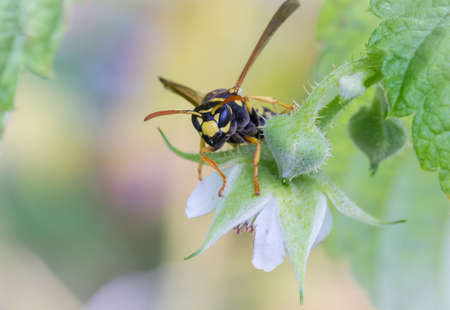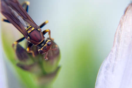 Wild wasp close up sits on a flower, natural background.