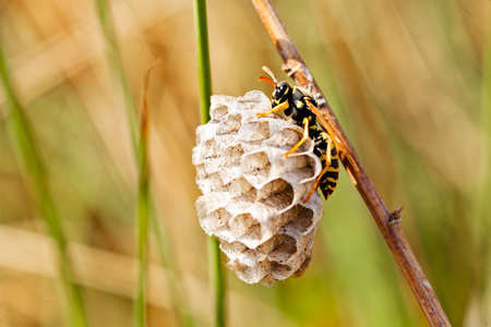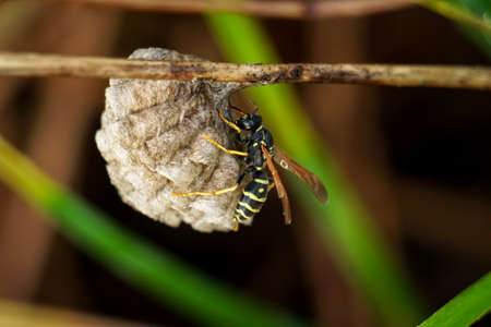 Common Paper Wasp building wasp nest on nature background, Insect macro photography, Selective focus.