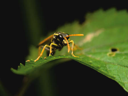 Wild european paper wasp sits on green leaf closeup